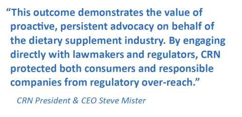 including clarification that dietary supplements are not subject to the state’s baby food testing and labeling requirements established under AB 899. “This clarification ensures that consumers continue to have access to safe, beneficial supplement products for their families without unnecessary regulatory confusion,” said CRN President & CEO Steve Mister in a press release. CRN will monitor the state’s implementation to ensure that supplements remain exempted, and member companies are not subject to unintended enforcement.