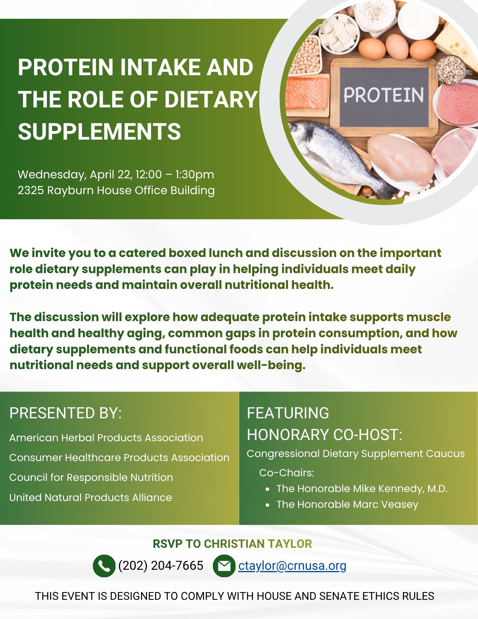 Join us for a briefing on Capitol Hill with honorary co-host, the Congressional Dietary Supplement Caucus! We invite you to a catered boxed lunch and discussion on the important role dietary supplements can play in helping individuals meet daily protein needs and maintain overall nutritional health.