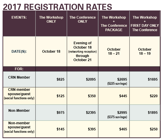 - Participation in all sessions of The Workshop and the first day of The Conference (unless otherwise indicated, e.g., "CRN Members Only")