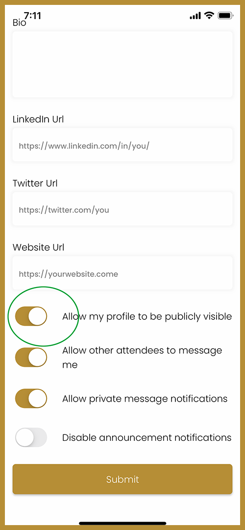 If you don't see yourself listed among attendees in the app, it could be because of your privacy setting selections made at registration.