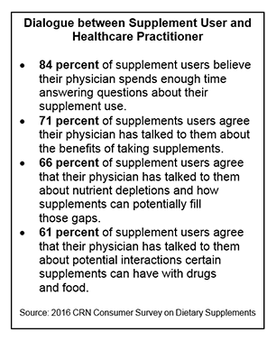 “The number one goal of the dietary supplement industry is consumer safety,” said Duffy MacKay, N.D., senior vice president, scientific & regulatory affairs, CRN. “We are pleased to see that as more and more Americans incorporate dietary supplements into their health and wellness regimens, they are disclosing their use of these products to their healthcare practitioners in an effort to use supplements safely and responsibly. An open dialogue between a patient and a healthcare practitioner—whether a doctor, registered dietitian, or pharmacist—is crucial for achieving good health, and, according to CRN’s survey, dietary supplement users recognize that.”