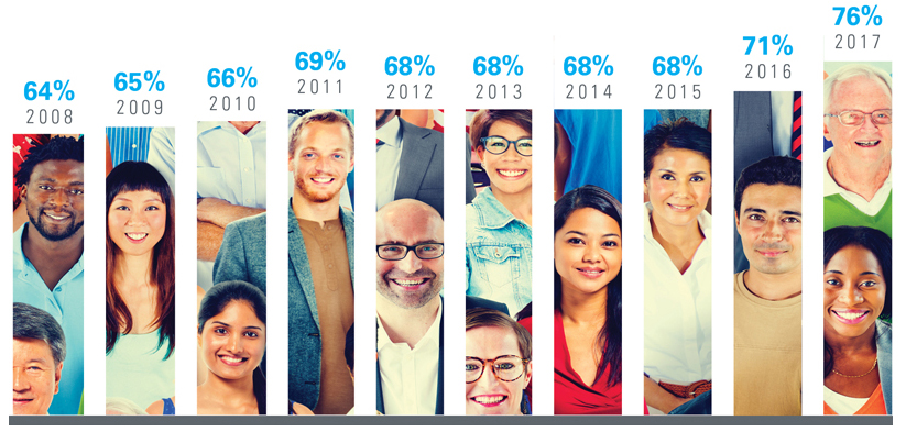 The 2017 CRN Consumer Survey on Dietary Supplements shows 76% of Americans are taking dietary supplements, up from 64% ten years ago in 2008.